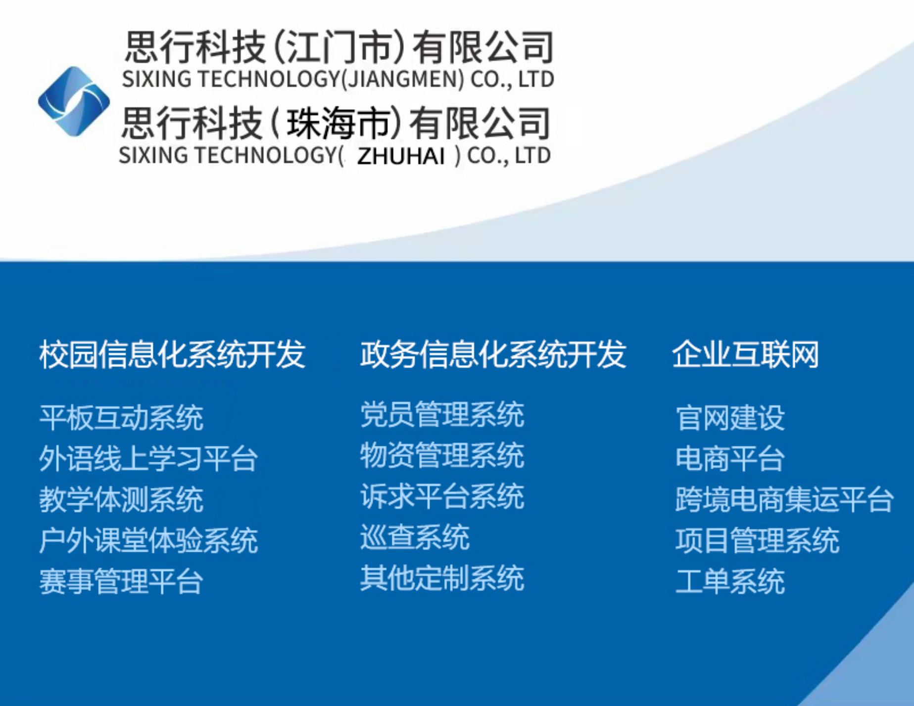 思行科技(江門市)有限公司 SIXING TECHNOLOGY CO., LTD 思行科技一直致力于高端平臺的定制開發服務,主要涵蓋兩個方面服務:一是教育平臺的開發及運營;二是提供江門本地化服務,小程序,APP,微信H5,3D小游戲,網站等的定制開發及運營推廣。